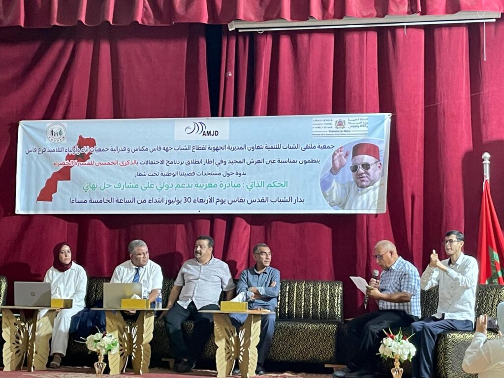 نظمت جمعية ملتقى الشباب للتنمية بمناسبة الذكرى 26 لعيد العرش المجيد ندوة بدار الشباب القدس بفاس بتعاون مع المديرية الجهوية لقطاع الشباب والفدرالية الوطنية لجمعيات أأأ التلاميد فرع فاس تحت عنوان الحكم الذاتي : من الطرح المغربي إلى الدعم الدولي ومشارف الحل النهائي